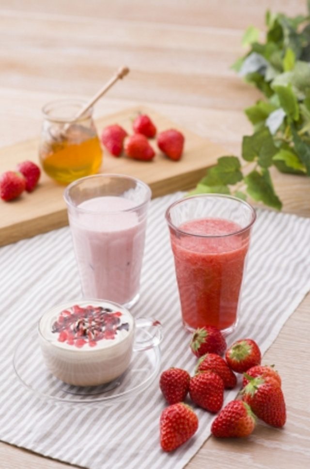 ベキュア ハニー マルシェ 渋谷モディ店は、ナチュラルコスメに加え、北海道産アカシア蜂蜜・果実・野菜を使用した、フレッシュでヘルシーなジュースやスムージーなどを販売するジュースバー「ハニーズキッチン」を併設した店舗です。その「ハニーズキッチン」では2月11日より、「苺フェアー」が開催されています。静岡県産「紅ほっぺ」を贅沢に使用した、期間限定3種の苺メニューが提供中です。