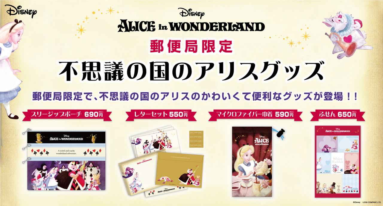 郵便局は「不思議の国のアリス」のアリスや人気のキャラクターをかわいいデザインで表現した限定の「不思議の国のアリス グッズ」を販売。全国約4,000の郵便局で販売される「不思議の国のアリスグッズ」は、スリージップポーチ、レターセット、マイクロファイバー巾着、ふせんの4種類です。