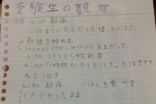 受験生の兄を観察した「弟の自由研究」が面白すぎると、Twitterで話題になっています。 受験生の兄を観察する弟 この画像を投稿しているのは、平手のどいやさん⊿(@cosmolibra)さん。 これは、弟さんがノートにまとめた「自由研究」だそうです。 弟の自由研究ぶっ飛ばすぞWW pic.twitter.com/YaI0b7fDJK — 平手のどいやさん⊿ (@cosmolibra) 2016年8月29日 「自由研究」のテーマは、受験生の兄(平手のどいやさん)の行動を観察すること! 起床から就寝するまで、平手のどいやさんの行動を詳細に記録しています。 起床後、しばらく「ぐだぐだ」したあと勉強を開始。 しかし、2時間くらいで、昼寝をし [...]