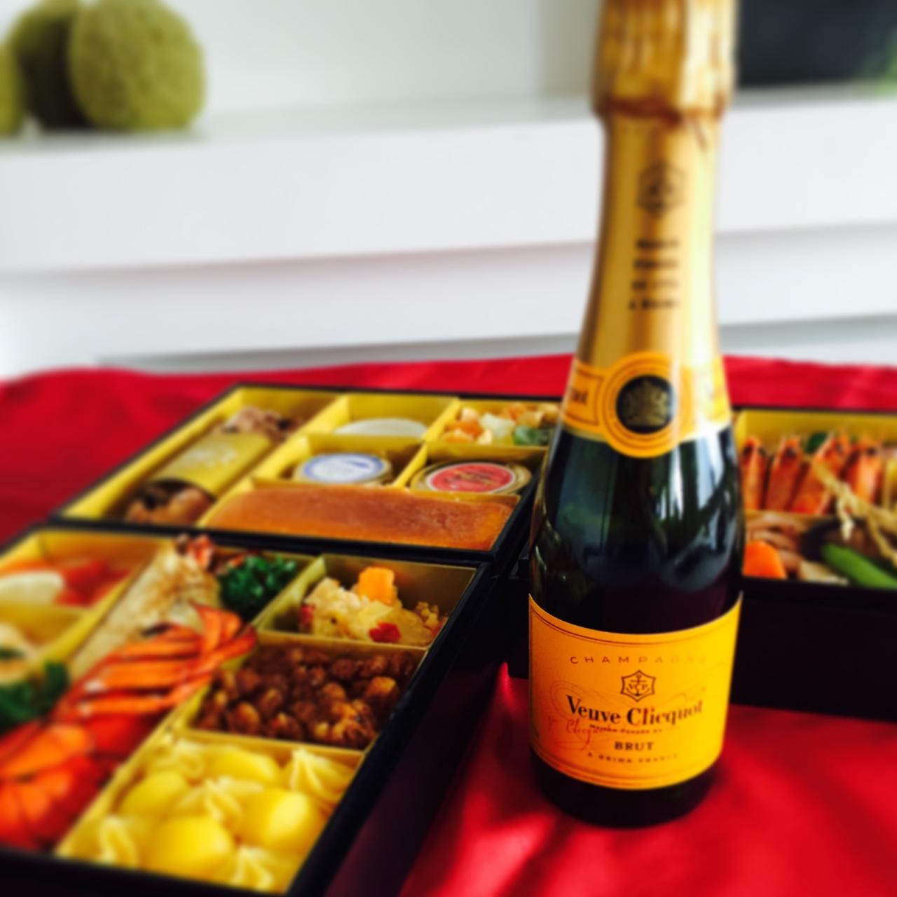 三段重にヴーヴ・クリコのハーフ、そしてアクセント三種と祝い箸のセット。