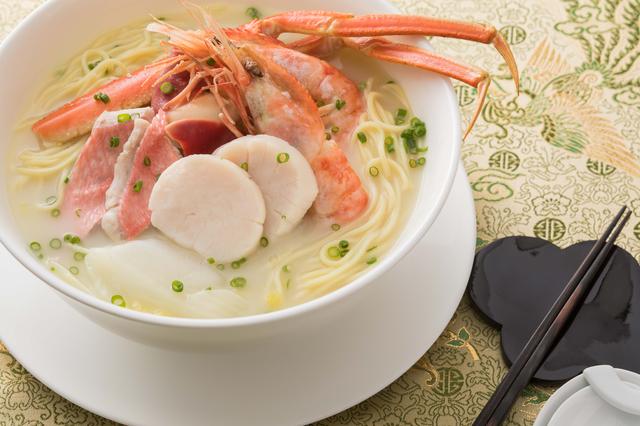 ランチタイムには、1日15食限定の「海鮮つゆそば」をご用意いたします。鶏肉と魚介から出汁をとったスープにボタン海老・本ズワイ蟹・北寄貝を贅沢にトッピングしました。北海道の旨味がたっぷり詰まった一杯を、ぜひこの機会にお楽しみください!