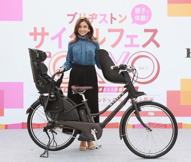 最近は朝5時前に起きて家事とモデル業を両立させているという滝沢さん。この春の流行を取り入れたボウタイブラウスで登場し、「最近はかっこいい系だけではなく可愛い系を意識したママが増えてます。限定モデルのHYDEE.Ⅱは、かっこいい系のブラウンと、可愛い系のホワイトが両方あってみんなに選んでもらいやすいラインナップ。おしゃれに乗るには、自転車のカラーに合わせてモノトーンで仕上げると素敵だと思う」と自転車と合わせたファッションのアドバイスも。