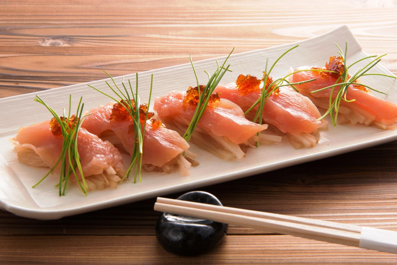 【根津 鶏はな】 東京ウドの味噌漬け 東京軍鶏の生ハム添え