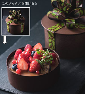 柊が描かれた印象的なリボンとボックスはすべてお召しあがりいただけるチョコレートで。ボックスを開けると、中にはストロベリーやブルーベリー、フランボワーズ、グロゼイユを飾った華やかなケーキが…!キャラメリゼしたナッツ入りムースリーヌやコーヒームースなどを6層に重ね、キャラメルモカ風味のショコラムースに仕上げました。6つの層が織りなす多彩な味わいは、ひと口ごとに濃厚な甘さが口の中に広がります!