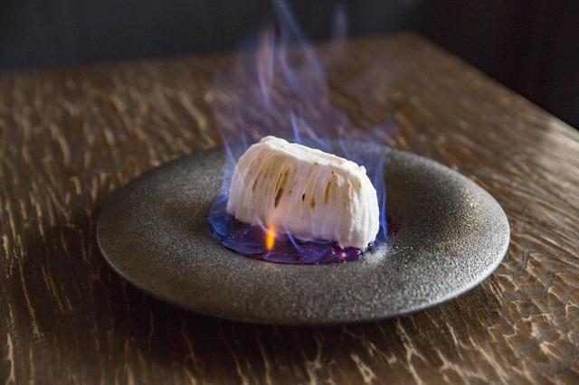 目の前でフランベされたかやぶきが炎によりゆっくりと茶色に色を付け始めます。フォトジェニック、ムービージェニックな瞬間を押さえることができます。ソルベのシャリシャリとした食感、口の中に広がるアイスのまったりとした食感、メレンゲのふんわりとした食感の3つの食感をお楽しみいただけ、さらに、ソルベやアイスの冷たさ、ソースとメレンゲの温かさ2つの温感が味わえる、新感覚スイーツです。