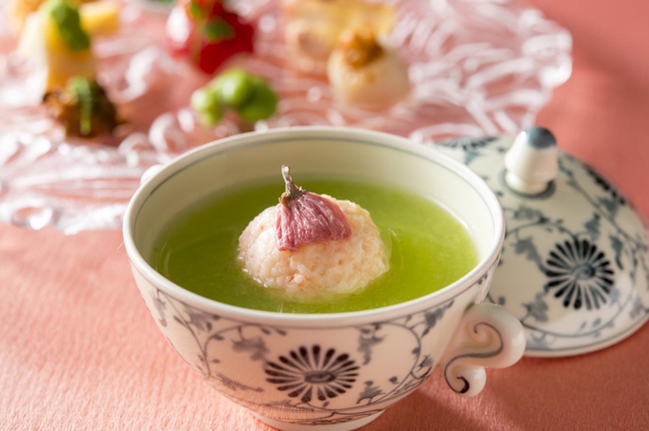 この時期甘みを増した「春キャベツ」を丁寧に裏ごし、毎日お店でとる風味豊かな出汁を合わせたお吸物。そこへ、まん丸く形づくられた「桜えび」の練り物を浮かべた春の香り満載の一品。また、京都で「ぶぶ」と呼ばれる茶漬けに用いられる細かい粒状のあられをまぶし揚げた百合根まんじゅうは、翡翠豆(ひすいまめ=グリーンピース)をペースト状にし、薄口しょうゆなどで味を整え、にんにくと白ワインで風味豊かに仕上げた一皿に。百合根で作られた花びらが、より一層春を演出しています。