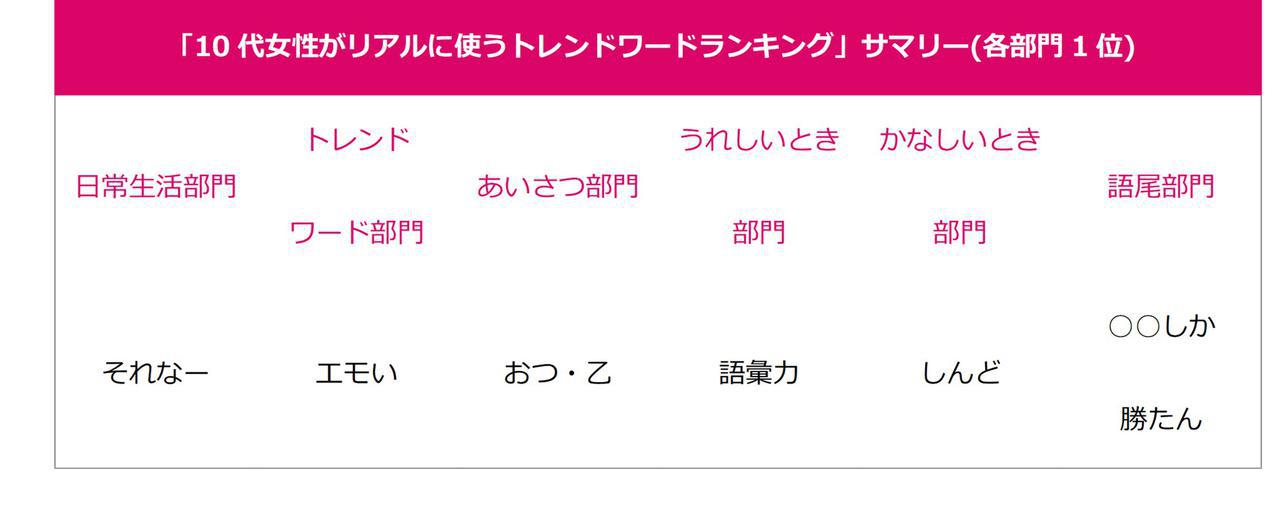 「Telop by goo」には、自動でテキスト化した音声通話から喜怒哀楽を読み取り、フォントや絵文字で装飾する機能があります。「Telop by goo」で文字装飾できる言葉のバリエーションを増やすため、今回は、流行に敏感な若者の間で使われる言葉に着目。10代女性を対象に、普段コミュニケーションを取る際、日常的に使用している言葉についてアンケート調査を実施しました。今回実施したアンケート調査の結果を基に、全6部門でランキングを作成。「日常生活部門」は「それなー」、「トレンドワード部門」は「エモい」、「うれしいとき部門」は「語彙力」、「かなしいとき部門」は「しんど」、「語尾部門」は「○○しか勝たん」が1位となりました。