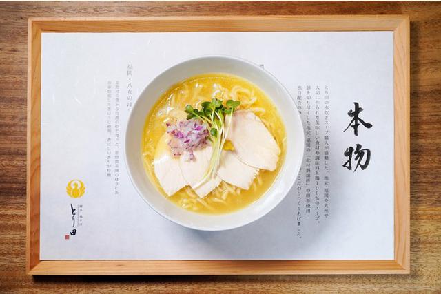 目指したものは《とろみ》と《うまみ》。鶏のうまみたっぷりのスープに地元福岡の醤油と鹿児島県産の厚削り節のかえしで合わせた博多水炊きとり田スープの進化系濃厚鶏そば。低温調理でしっとりと仕上げた薄切りの鶏チャーシューと大分県産の完熟した黄柚子の柚子胡椒を添えました。