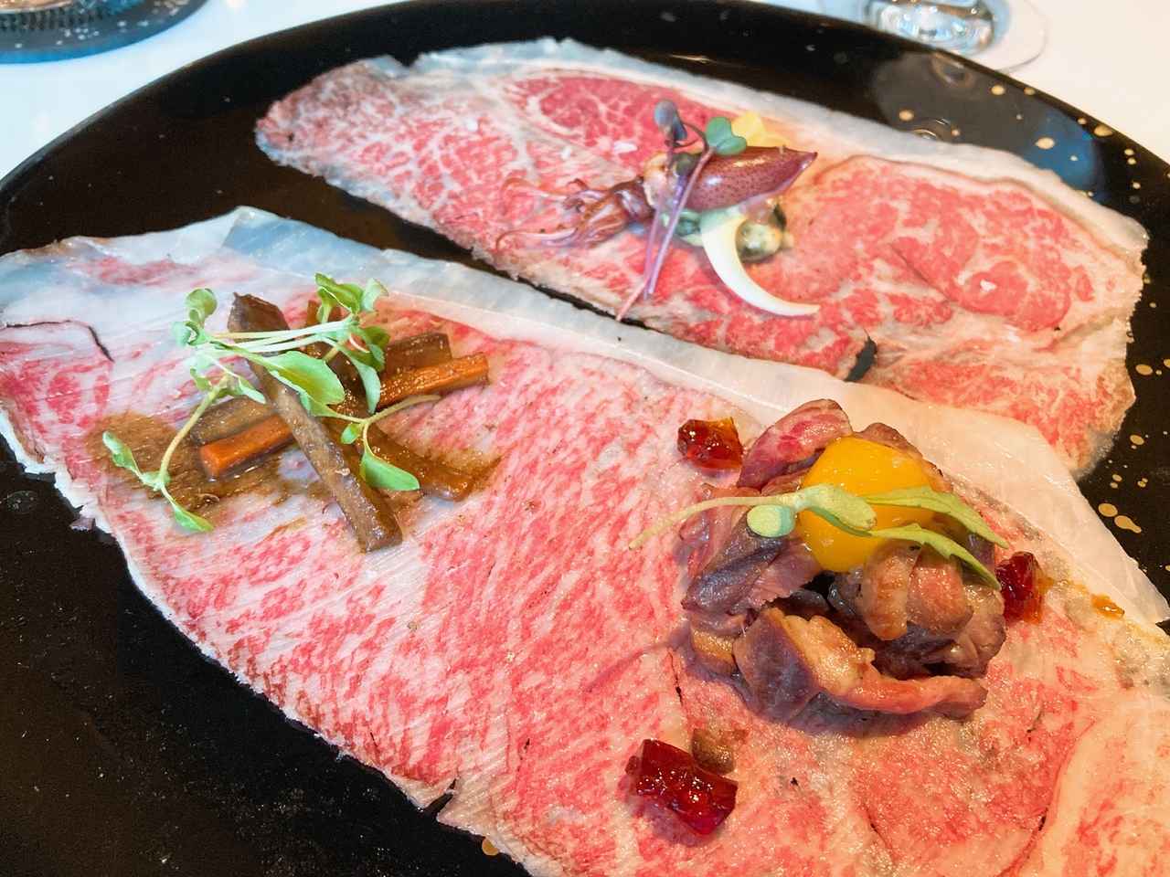 いただいているうちに登場したのが、薄切りサーロイン 3種のコンパレゾン。美しい霜降りのサーロインの上に、ホタルイカ、ごぼうのきんぴら、そしてすき焼き風に味付けされた“合法ユッケ”が乗っています。これを、お肉でクルっと巻いていただく贅沢な一皿!