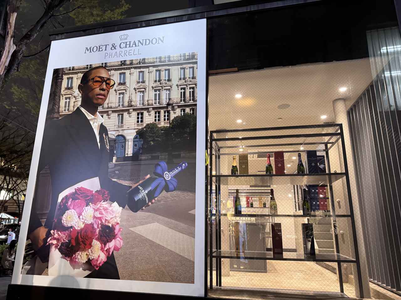 モエ・エ・シャンドンと花束を手にバースデーパーティーに駆けつけるファレル・ウィリアムスを映したビジュアルで、表参道に面する「V.A.」のウィンドウをラッピング。店内では「モエ・エ・シャンドン モエ アンペリアル ファレル ウィリアムス ギフトボックス」を期間限定で販売いたします。