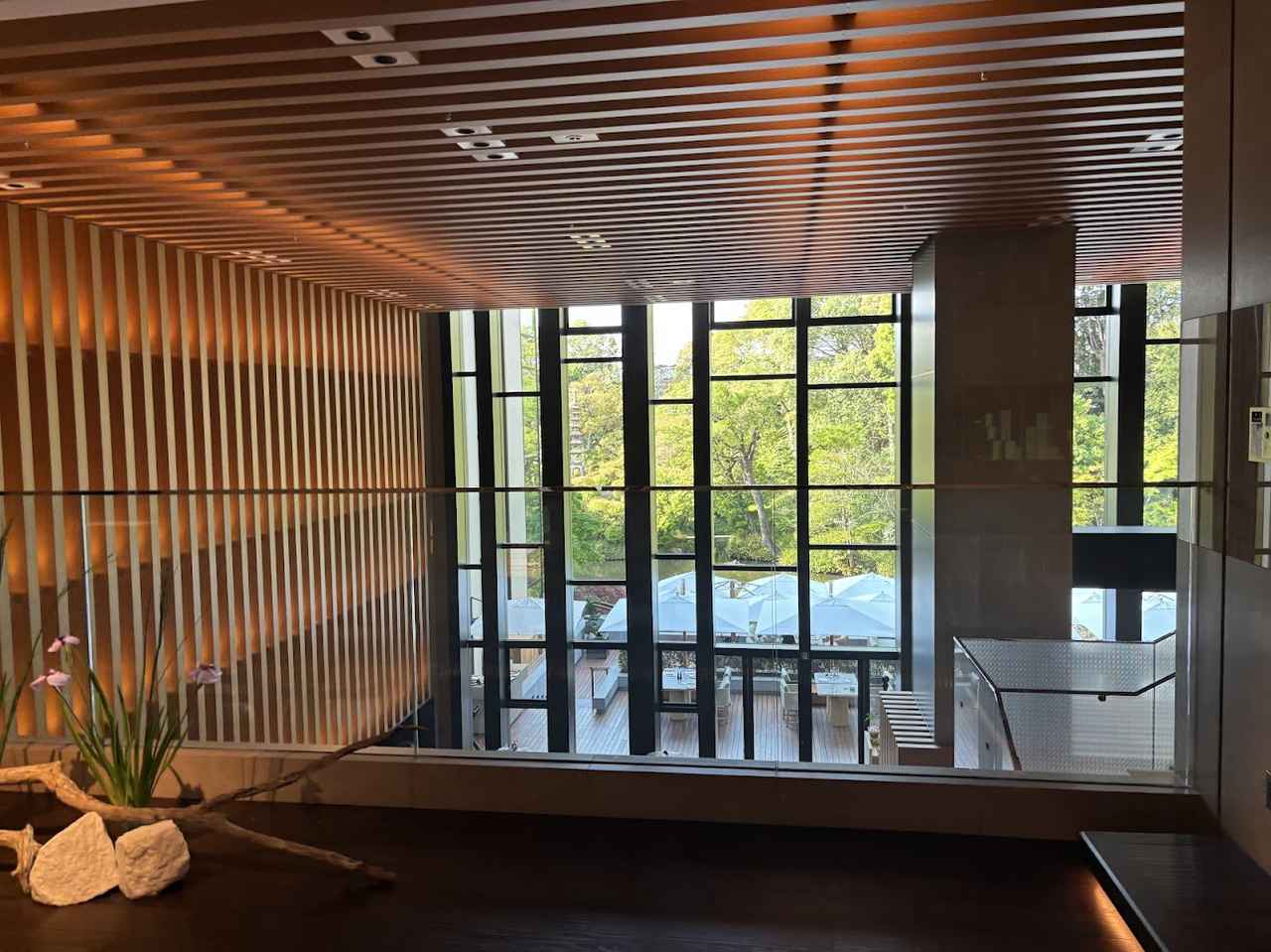 平家物語にも記された約 800 年の歴史を誇る池庭「積翠園(しゃくすいえん)」を臨むテラス席を全面的に刷新ということでうかがいました。昼間は自然光が降り注ぐ開放的な空間、夕方は暮れなずむ空を眺めながらリラックス、夜は幻想的なライトアップとともに幻想的な時間を過ごせます。