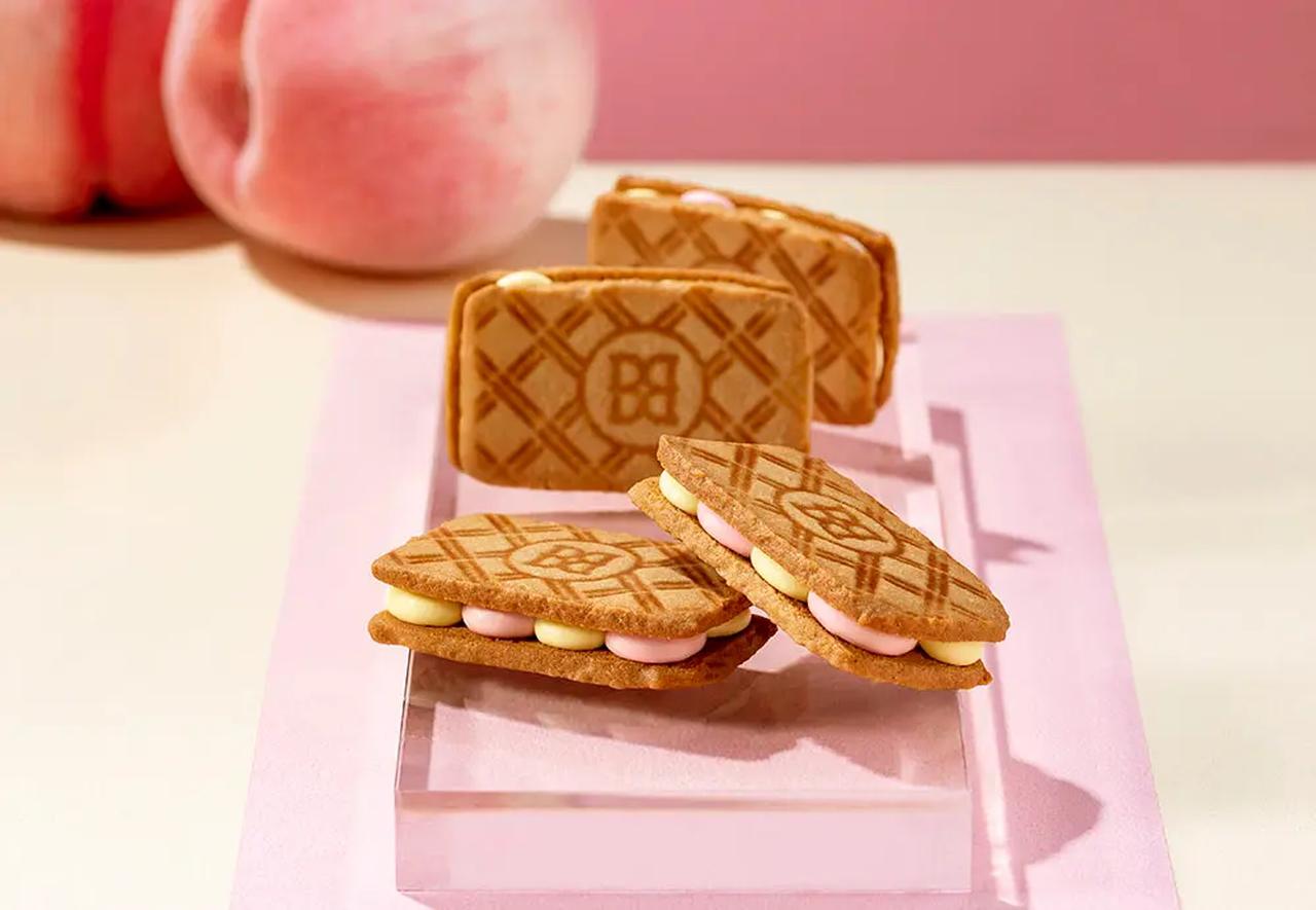 見た目もかわいい『白桃バターホイップサンド』。ミルキーでなめらかなくちどけの定番バターホイップショコラに、国産白桃の果汁感あふれる白桃ホイップショコラ。とろける2味のショコラをぷっくりと交互に絞りました。サクサクッと軽やかなバターサブレでサンドすれば、夏に食べたい爽やかショコラサンドのできあがり。