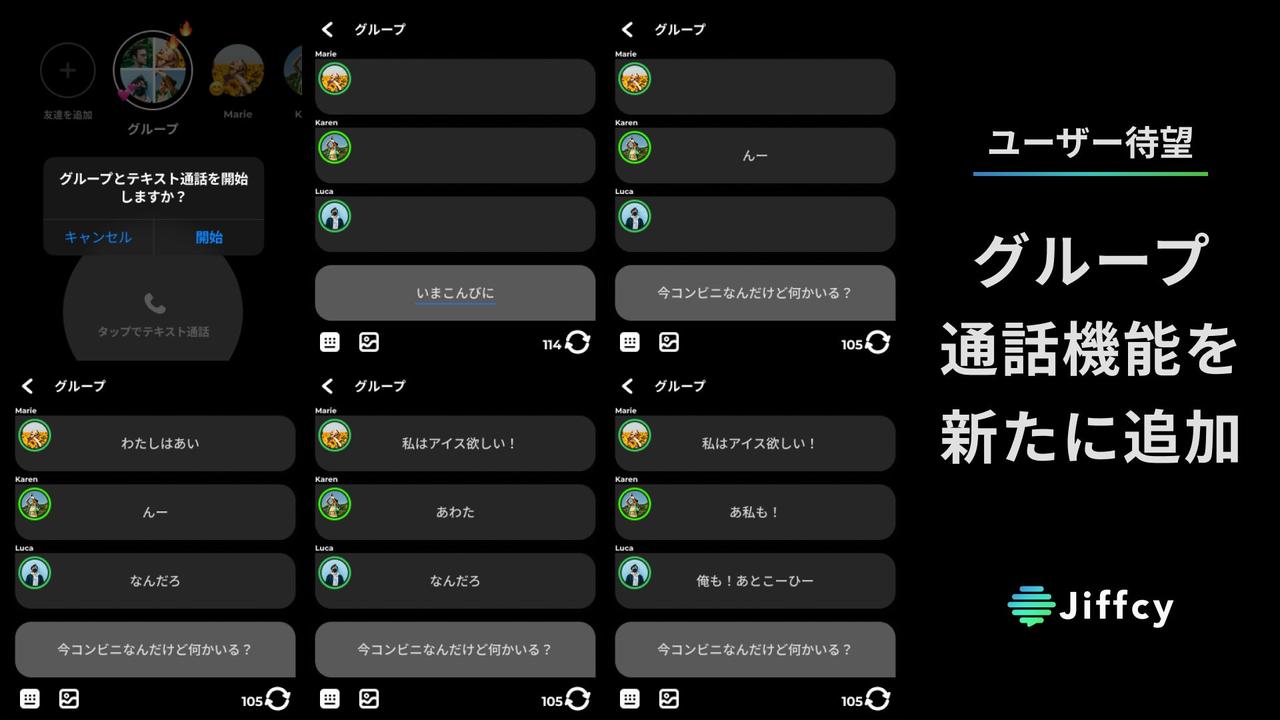 “テキストで通話する”という新しいコミュニケーションのかたちを提案するSNSアプリ『Jiffcy(ジフシー)』が、2025年6月19日に待望の「グループ通話機能」を正式リリース。最大4人まで同時に接続できるようになり、1対1では得られなかったグループならではの“今ここに一緒にいる”感覚が、文字だけで実現可能になりました。