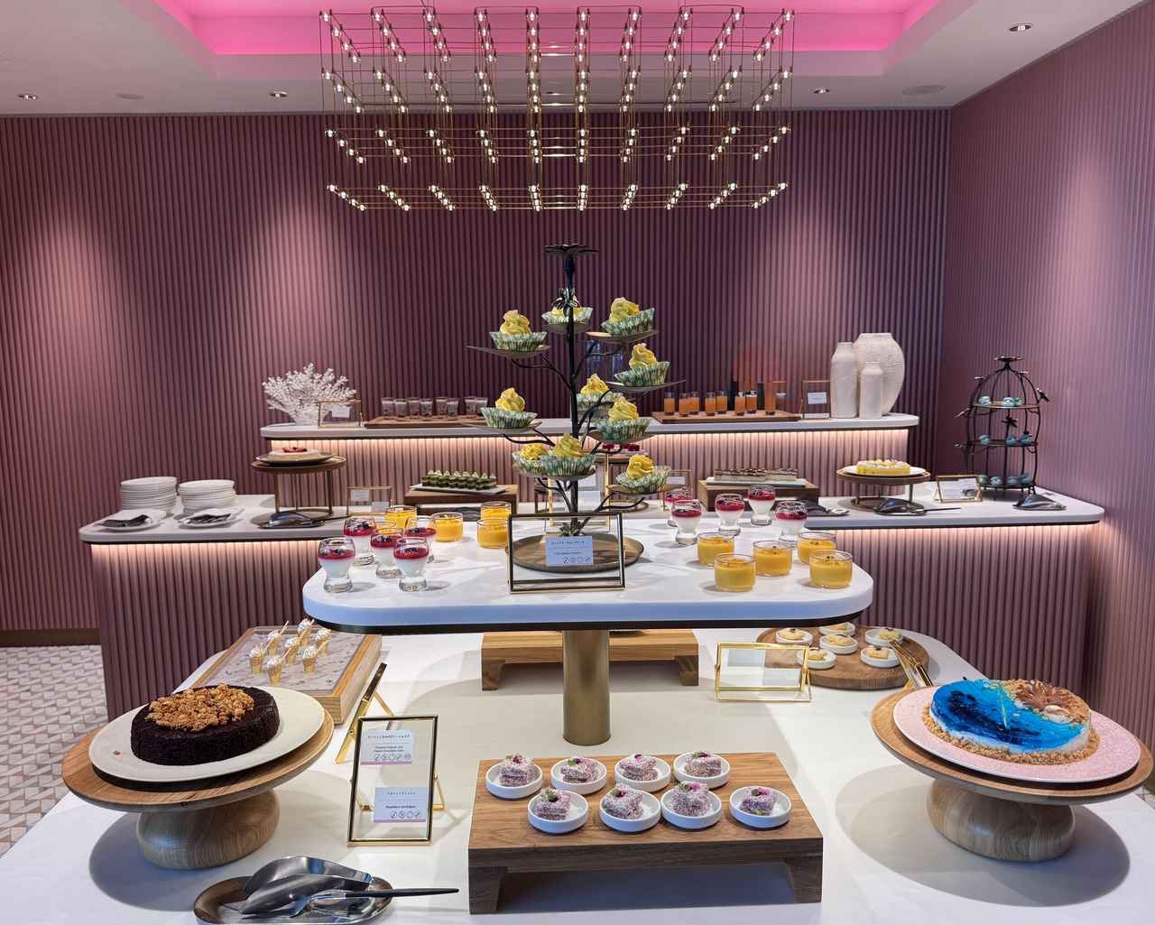 マカロンやケーキ、グラスデザートに至るまで、カラフル&フォトジェニックなスイーツが勢ぞろい。パステルカラーのスイーツたちがまるで宝石箱のように並び、どこを切り取ってもSNS映え間違いなし♡