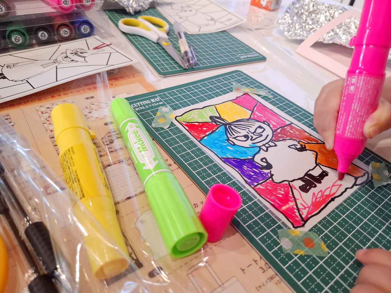 ムーミンとその仲間たちのイラストの中から、好きなものを一つ選びます。透明のカードを用紙の上にのせて、まずは黒のマジックでイラストをなぞります。なぞれたら、カードを裏返して色を塗っていきます。