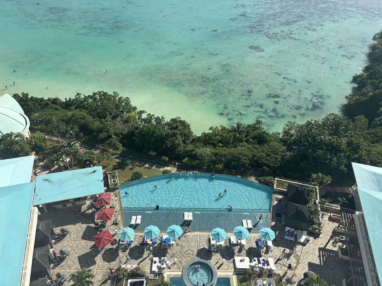 ロッテホテルグアムは、グアムを代表するリゾート地のタモンビーチ前に位置し、美しいオーシャンフロントの絶景を楽しめます。こちらは実際に私たちの部屋からの撮影したプールの写真。