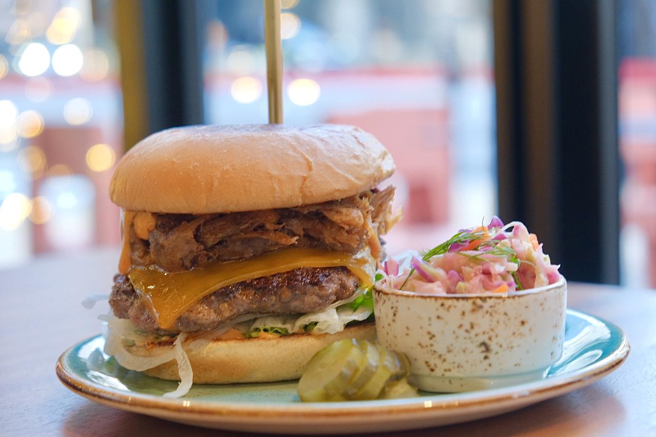 そしてご覧ください…!このボリューム感!!片手で持ちきれないほどのこの厚みのワケ…そう、先ほどご紹介した甘くジューシーなプルドポーク…に、なんとビーフパテをも挟んだ一品なんです。チーズにオニオンにレタスにと、見た目以上にとにかくボリューミーな一品なんですよ。
