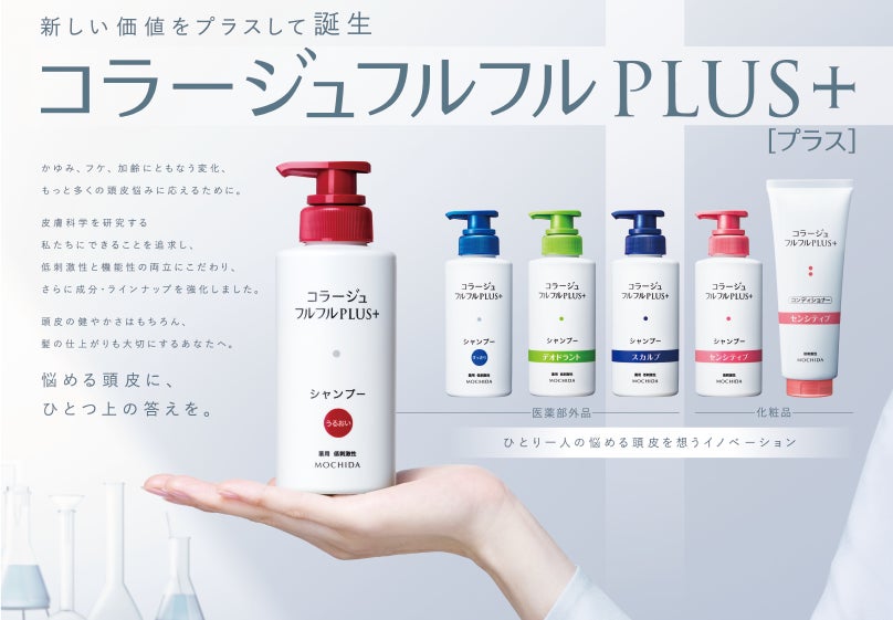 「コラージュフルフル」は、1999年に日本で初めてフケ原因菌に着目した抗真菌成分配合の薬用シャンプーとして誕生。以降、低刺激性と機能性の両立を重視しながら、フケ・かゆみなど頭皮トラブルに寄り添うブランドとして支持されてきました。今回登場する「プラスシリーズ」は、「頭皮の悩みに、メディカル発想でひとつ上の答えを」をコンセプトに、皮膚科学の視点から頭皮環境を分析。かゆみ、フケ、ニオイ、加齢に伴う変化といった4つの悩みに対応した全6製品がラインナップされています。