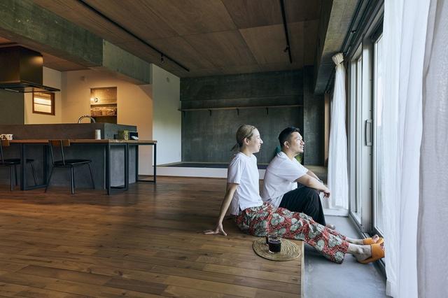 造作家具や意匠性の高い素材を多用し、メリハリを効かせたリノベーション事例です。天井にはラワン合板を大胆に採用し、空間に個性を与えています。オープンキッチンはリビングを見渡せる設計で、機能性も重視。強力な食洗機を導入し、家事負担の軽減にも配慮しています。キッチンの高さは施主の体格に合わせて設定し、作業しやすさを追求しました。屋久杉を使った可動式テーブルは、カウンターとしてもダイニングテーブルとしても活用可能。パントリーにはコーヒーマシンやコーヒーカップを並べ、趣味を暮らしの中心に取り入れています。インナーバルコニーの土間スペースは、公園の緑を借景にできる立地を活かした設計。コーヒーやお酒を楽しめる、日常の中の特別な時間を演出しています。