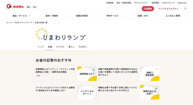 「ひまわりランプ」は、お金・ビジネス・暮らし・ちばぎんの4つのカテゴリで構成されています。