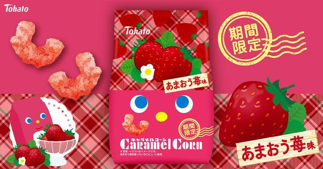 ふんわり、サクサク、そしてすうっととろけるキャラメルコーンから、期間限定で「あまおう苺味」を発売いたします。フルーティなあまおう苺のピューレを使用し、爽やかで甘酸っぱい味わいに仕上げました。冬の季節にぴったりなキャラメルコーンをお楽しみください。