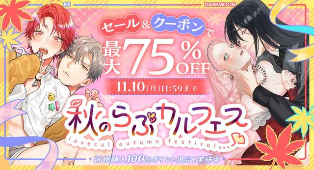 TL・BL向け二次元コンテンツ販売サービス「らぶカル」では、11月10日(月)11:59まで、秋の大型キャンペーン「秋のらぶカルフェス」を開催しています。期間中は、対象作品の30%OFFセールや割引クーポン配布、初回購入者へのポイント還元など、さまざまな特典を用意。お得に人気作品を楽しめる1ヶ月となっています。