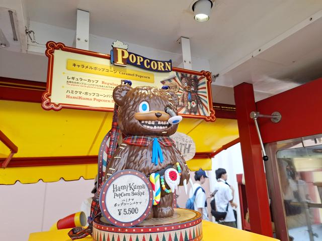 ハミクマ・ポップコーンバケツは、とにかくかわいい。存在感が、すごい。ストラップがチェックなのも最高!...
