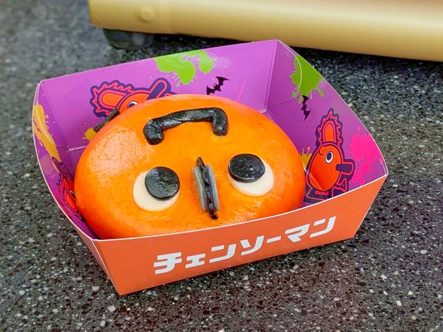 シネマ4-D前フードカートでは、チェンソーマンのフードを販売しています。キノコとベーコンがつまった、おかず系まんです。ピザまんみたいな感じです。
